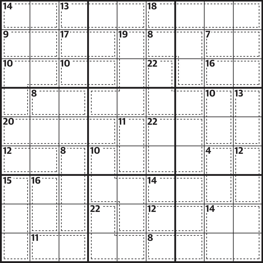 Normal sudoku rules apply, except the numbers in the cells contained within dotted lines add up to the figures in the corner. No number can be repeated within each shape formed by dotted lines.