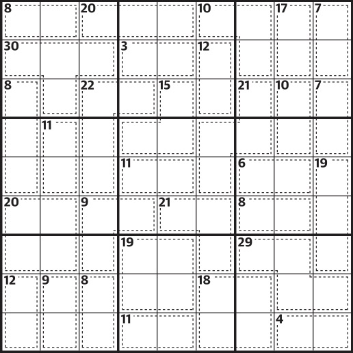 Normal sudoku rules apply, except the numbers in the cells contained within dotted lines add up to the figures in the corner. No number can be repeated within each shape formed by dotted lines.
