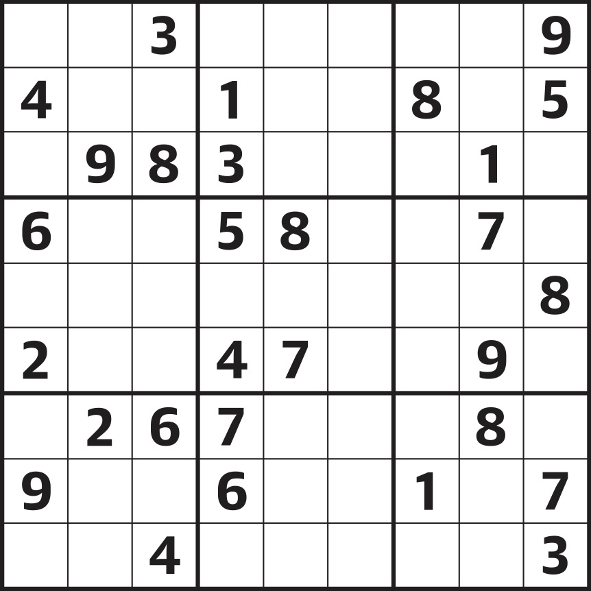 Fill the grid so that every row, every column and every 3x3 box contains the numbers 1 to 9.